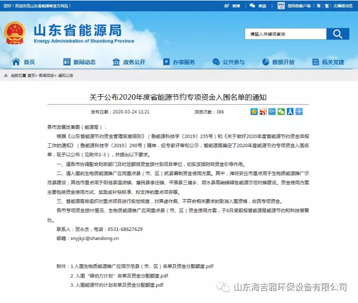 热烈祝贺(he)海吉雅环保设(she)备有限公司入围2020年度山东省(sheng)能源节约项目