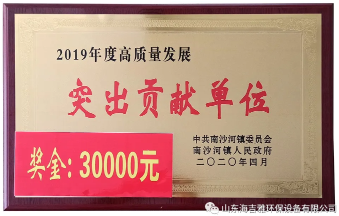 2019年度海(hai)吉(ji)雅环保实现税收一千五(wu)百(bai)余(yu)万(wan)元为南沙河镇经(jing)济发展做出了重要贡献,荣获“高质量发展突出贡献单(dan)位”称号(hao)。