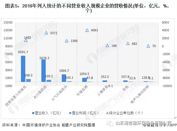 据我国(guo)环(huan)境保护产业协会统(tong)计数据,2019年1492家固(gu)废处置(zhi)与资源化企业实现营(ying)业收(shou)入6591.7亿元,实现(xian)营业利润598.3亿元;3372家水污染防治企业实现营业收入5676.3亿(yi)元,实(shi)现营业利润539.2亿元;1366家(jia)大气(qi)污染防治企业实现营业收入1904.7亿元,实现营业利润143.1亿元。