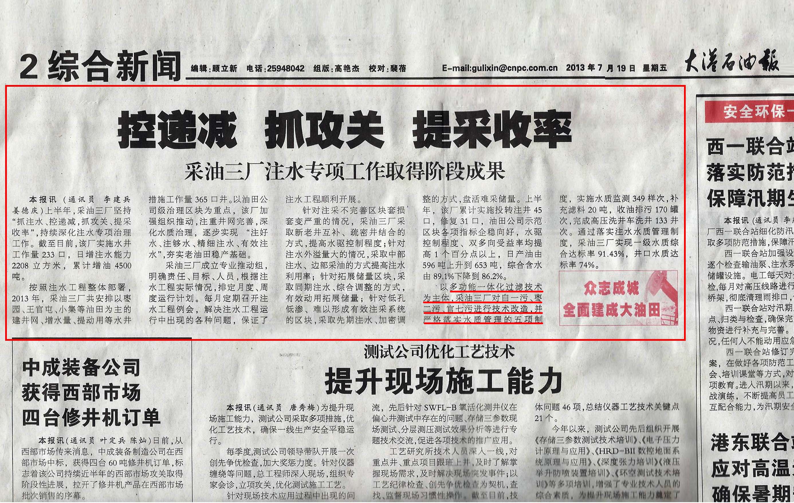 2013年6月公司产品被《大港石油(you)报》多次报(bao)道
